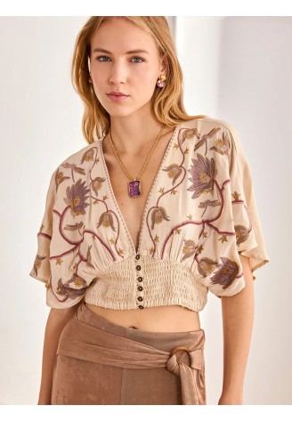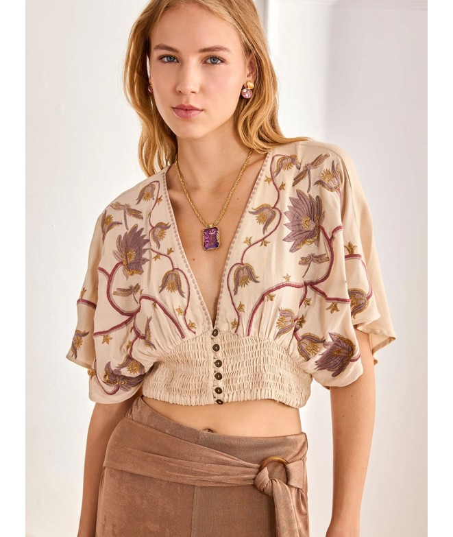 BLUSA VISCOSA BORDADO FLORAL Y CENTRUA NIDO DE ABEJA
