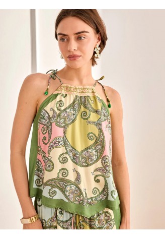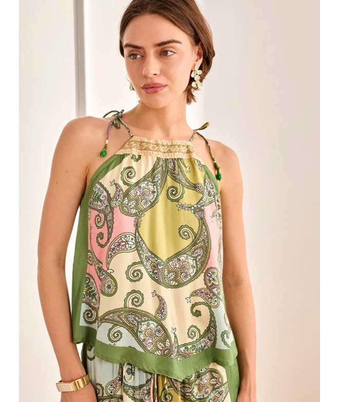TOP VISCOSA ESTAMPADO PAISLEY CON CUELLO HALTER BORDADO