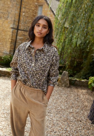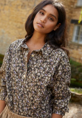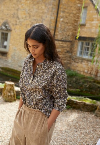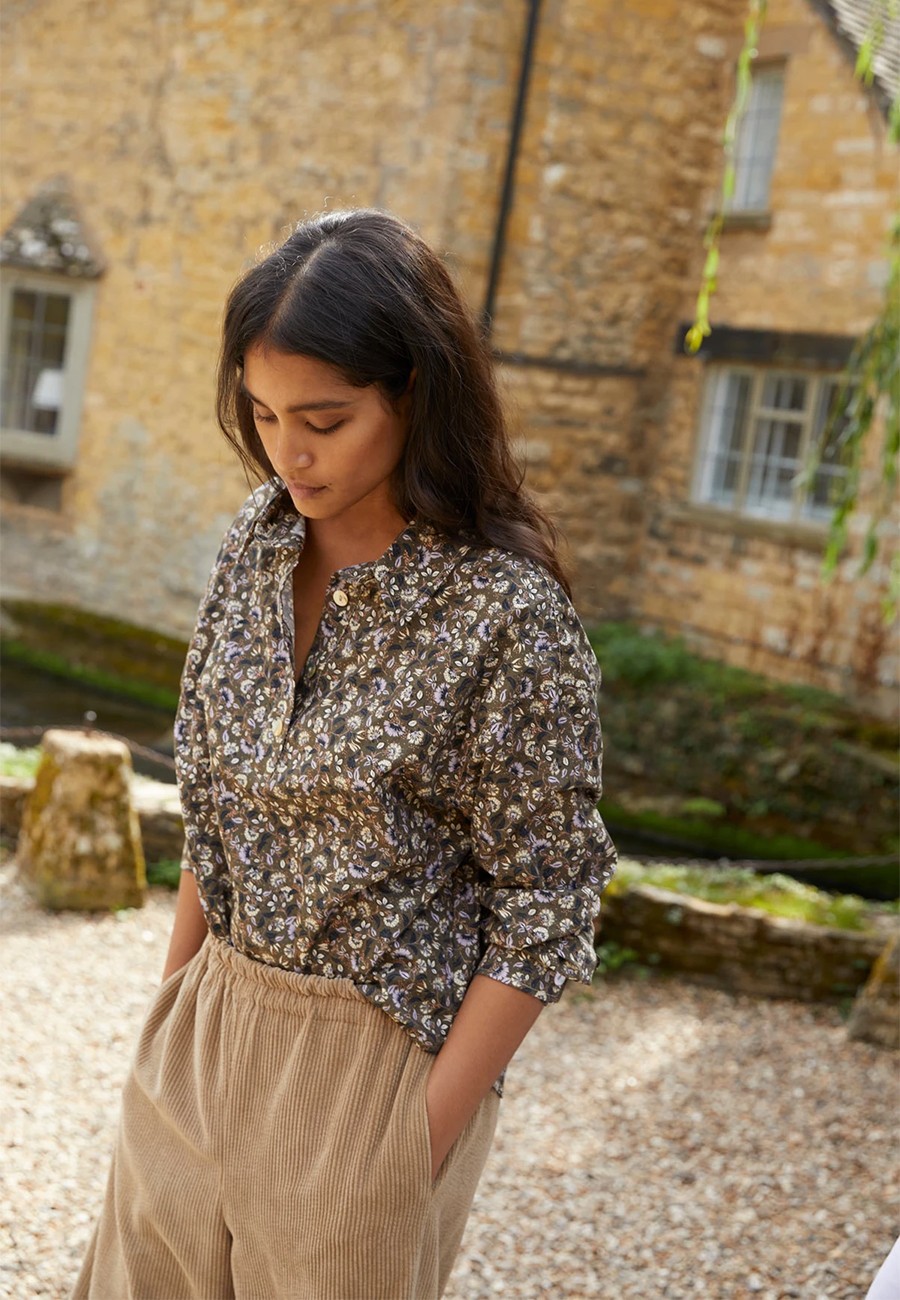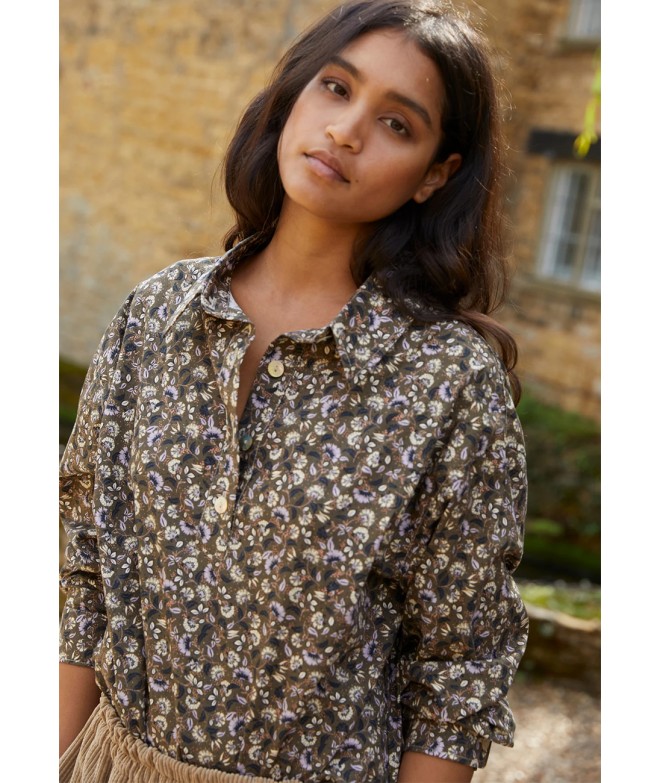Blusa camisera con bolsillos en el frontal y trabillas en el escote. Puños rectos con dos botones.