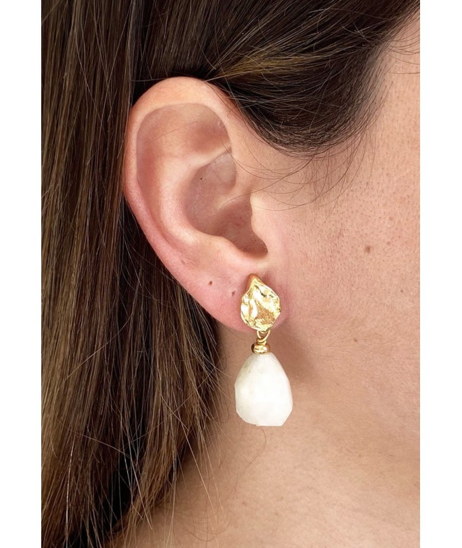 Pendientes hoja bañados en oro de 18 quilates con una piedraluna en forma de nugget. El tope del pendiente es XL con un plato de 9,5mm. para una mejor sujeción. Hechos a mano 100% en España.
