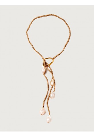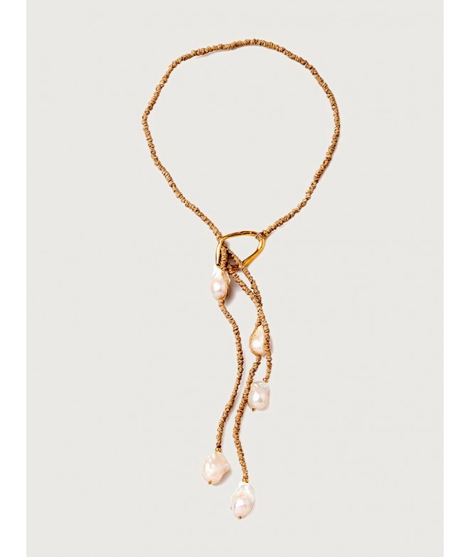 LARIAT LINO ANUDADO A MANO CON ARO BAÑO ORO Y 5 PERLAS BARROCAS